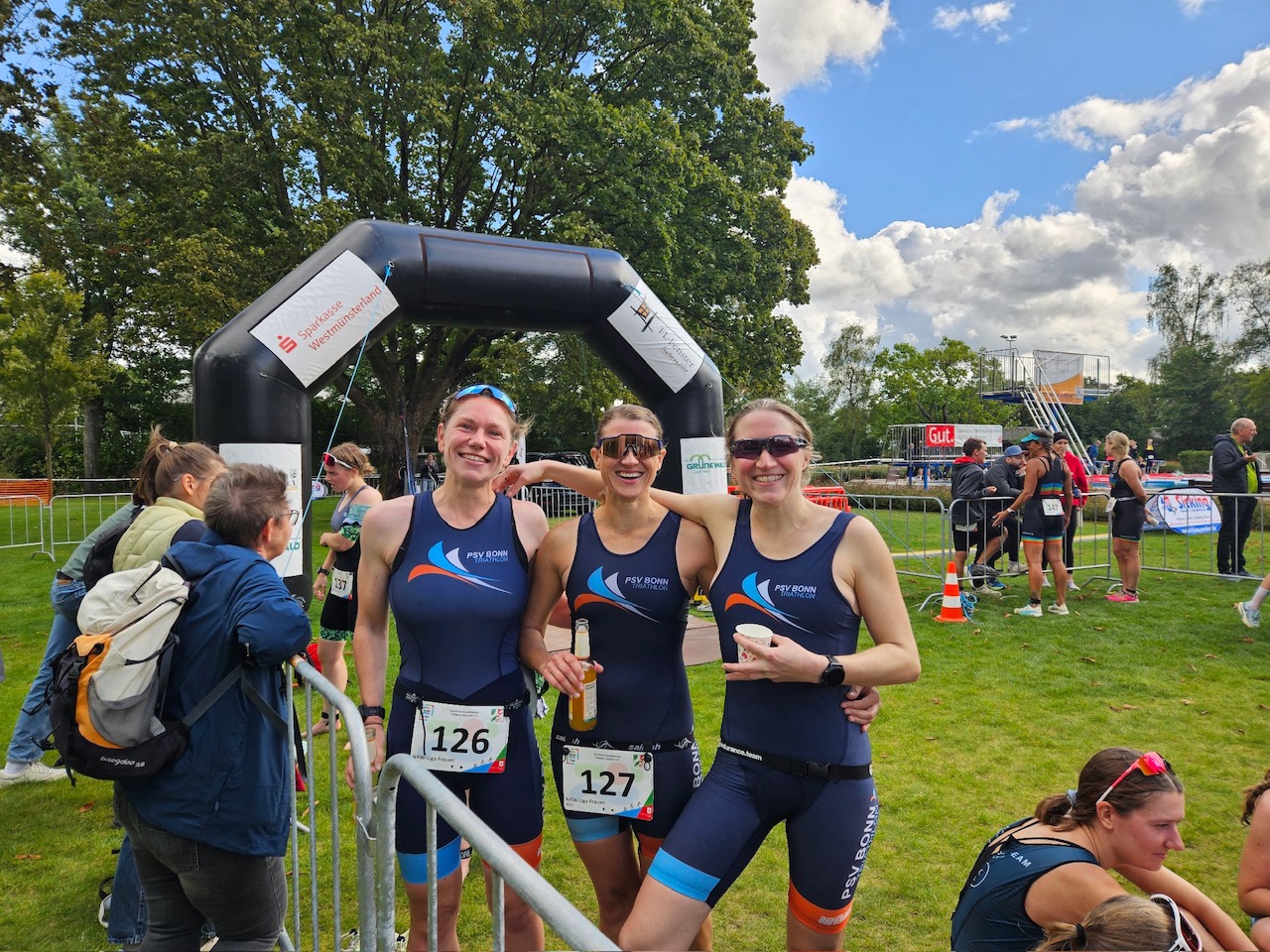 Ein Sprint für die NRW-Damen-Mannschaft stand für Sabine, Annelotte und Milena an: 750 Meter Schwimmen im Becken, 20 km Fahrrad auf einer kurven- und rundenreichen Strecke und etwas mehr als 5 km Laufen. Das Becken war mit 24 Grad angenehm warm und auch wenn es anfangs noch etwas nass erschien, kam am Ende zum Glück noch ein bisschen die Sonne raus. Getrübt war der Sprint von einem schweren Sturz von zwei Teilnehmerinnen aus anderen Mannschaften und von einem Sturz der vorher gestarteten Jungs in der NRW-Herren-Mannschaft. Gute Besserung, Sebastian! 🙁
